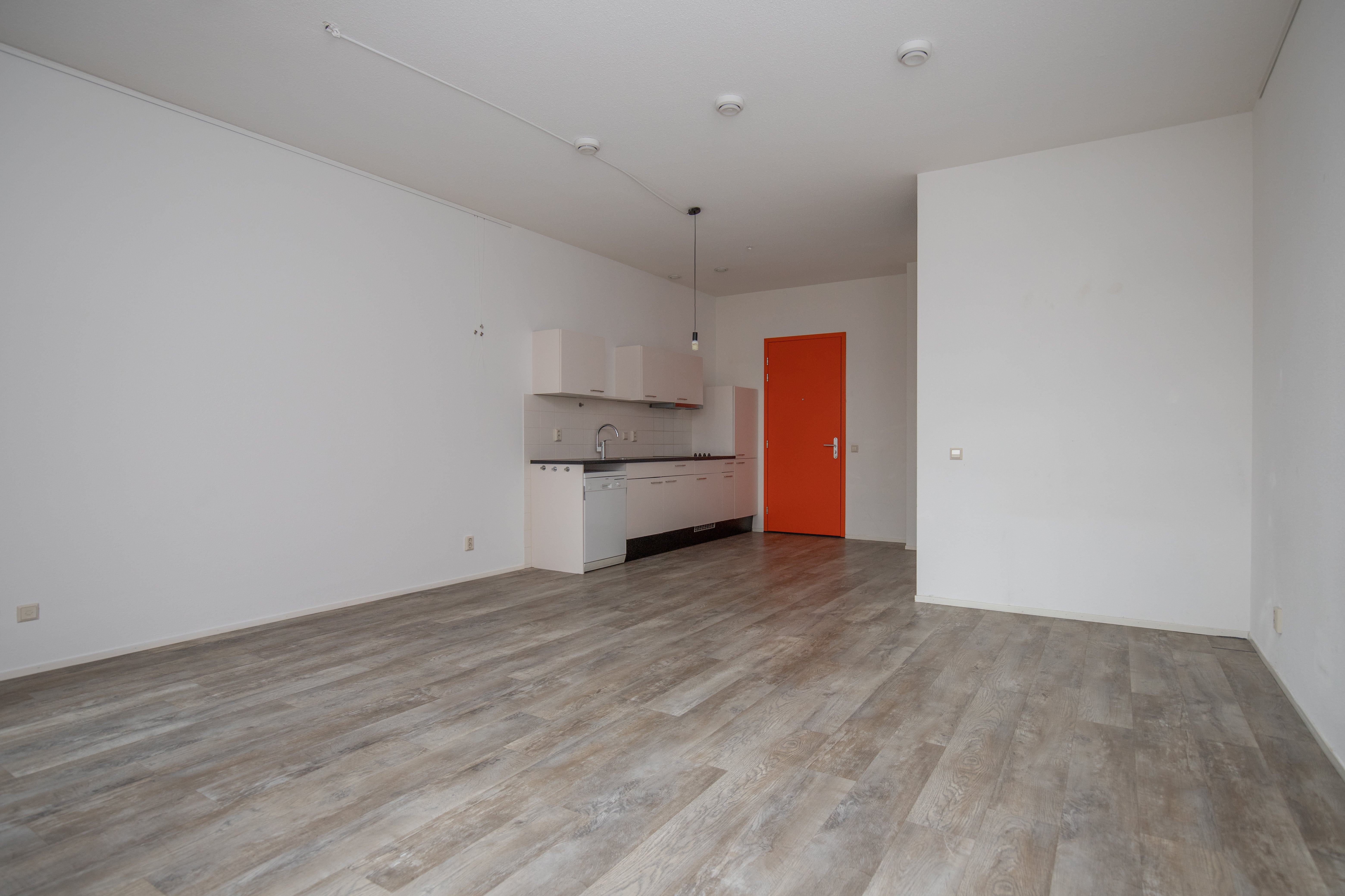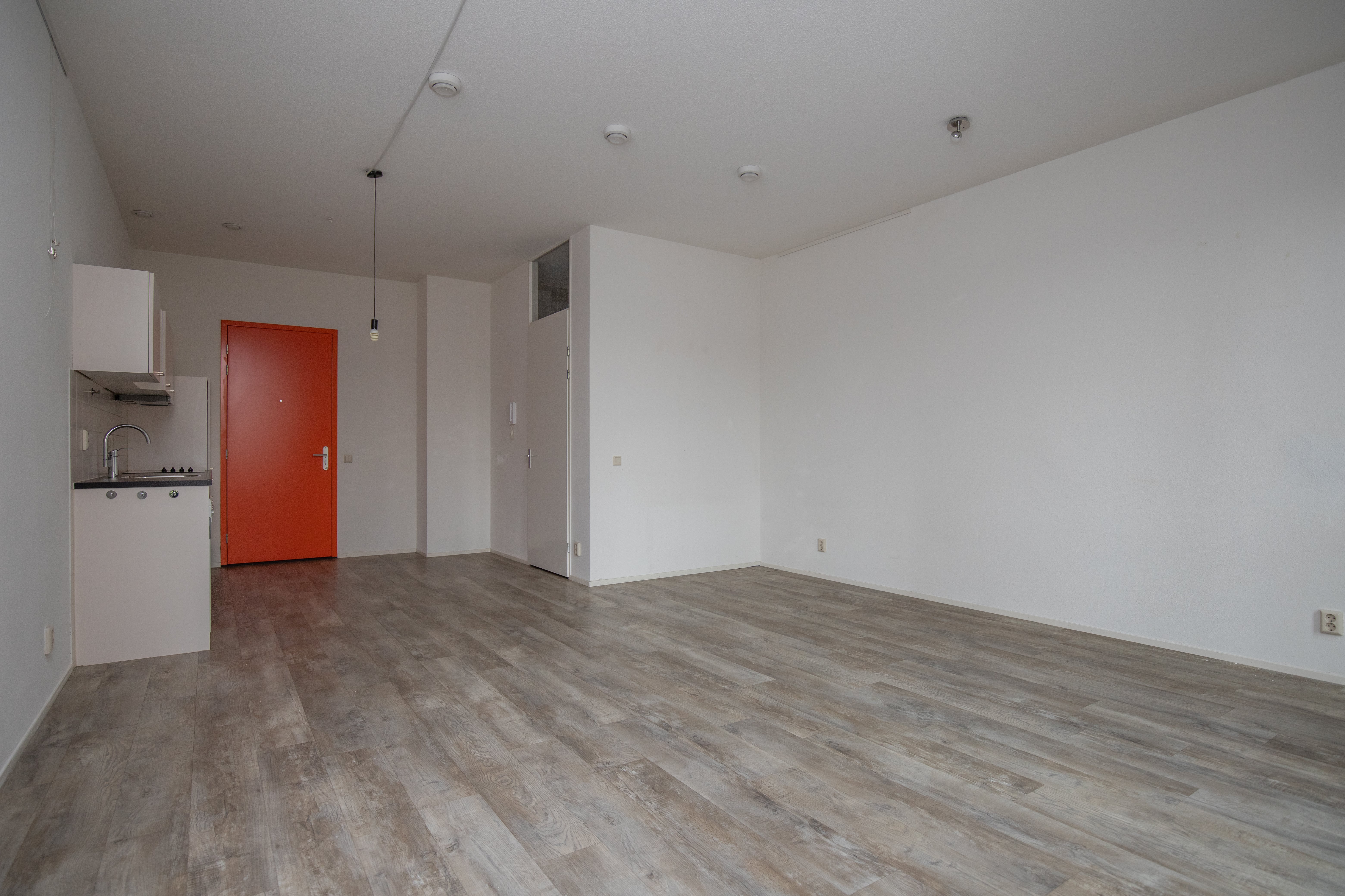 This studio has a bathroom and a living/bed room with a kitchen. The kitchen includes a flexible space and connection for a dishwasher. Further it is equipped with a ceramic cooker and a fridge freezer combination. In addition, the apartments are unfurnished but fitted with high quality PVC flooring and fire-safe curtains.