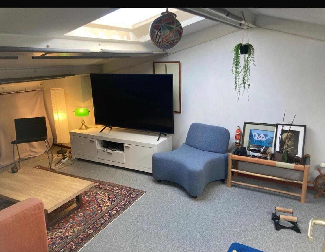 A cozy communal attic with a couch and TV.