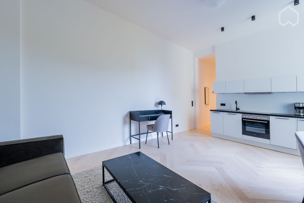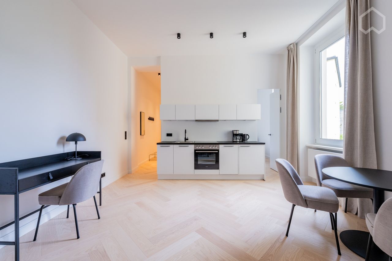 De lichte ruimte loopt over in een eethoek, perfect voor intieme maaltijden of een kopje koffie in de ochtend, met elegante gestoffeerde stoelen en een ronde tafel. De open keuken maakt indruk met zijn minimalistische witte kasten en contrasterende zwarte werkbladen.