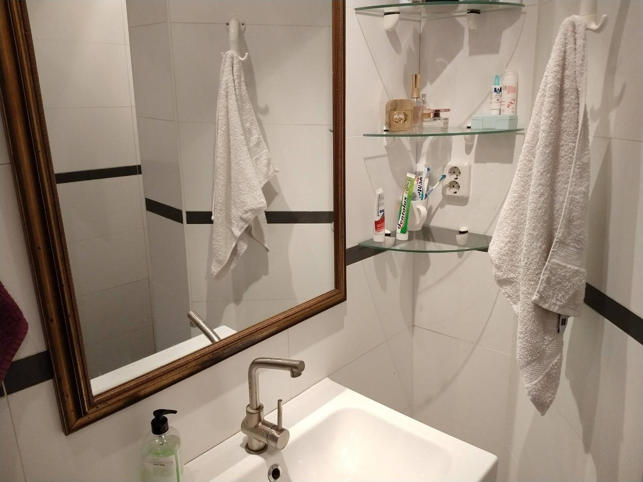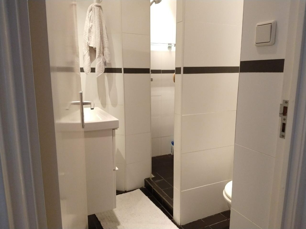 Het appartement heeft een moderne en nette badkamer met douche, toilet, föhn en spiegel. Bij de ingang staan een wasmachine en droger.