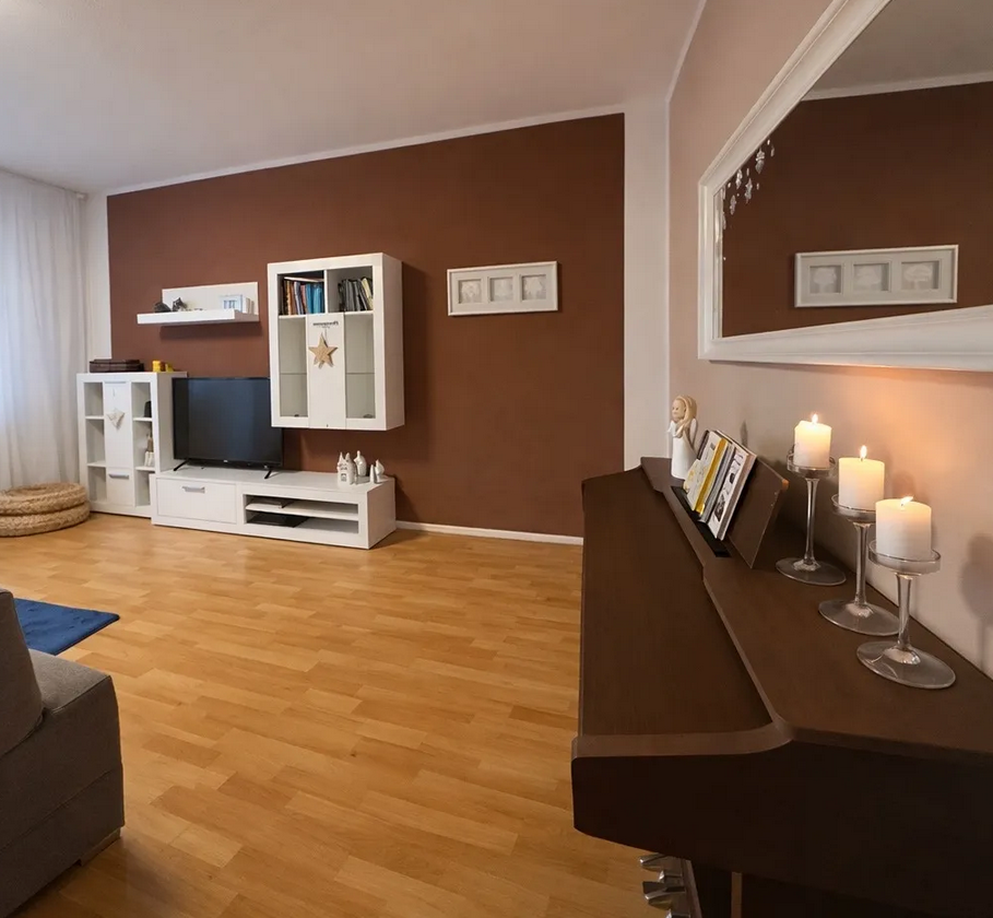 Een royale woonkamer met balkon, een grote kinderkamer, opgedeeld in een dag- en een nachtgedeelte om te ontspannen. Een ruime hal met voldoende opbergruimte en een slaapkamer voor de ouders. Het appartement beschikt over een balkon van 7 m² en een terras, die een veilige buitenruimte bieden om te spelen en te ontspannen, evenals een ruime kelder voor het opbergen van fietsen en kinderspullen.