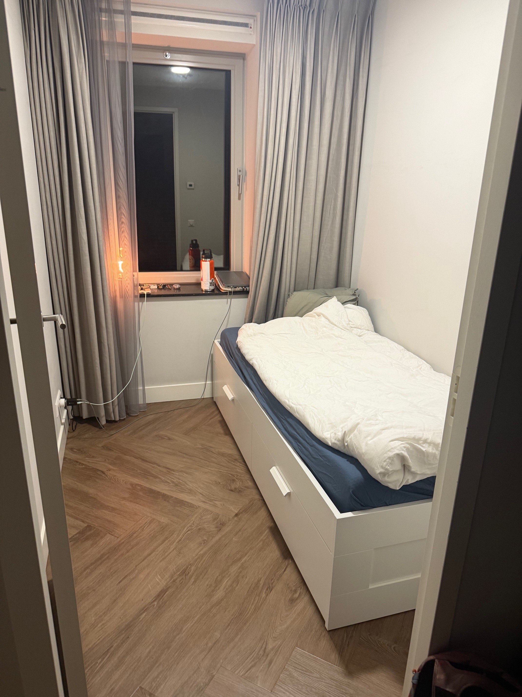 The room is on the smaller side but cozy. It comes furnished with a single bed, under-bed storage, and additional space in the utility room for shoes and other items.
